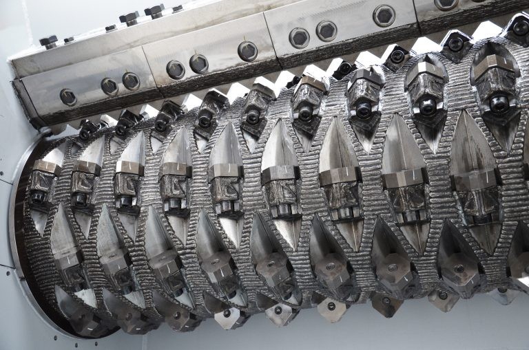 パワーラインローターは、高い自重により、破砕に必要なトルクを低減します。摩耗の増大を防ぐため、フルシェル構造または溶接シーム構造のVautid保護機構を採用しています。側面に取り付けられたCreusabro®製のローターフェースプレートは、研磨材の飛散を防ぎます。シャフトジャーナルは両側からボルトで固定されています。切断刃は60mm、80mm、100mmの3種類から選択可能です。